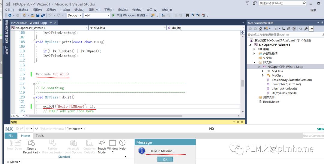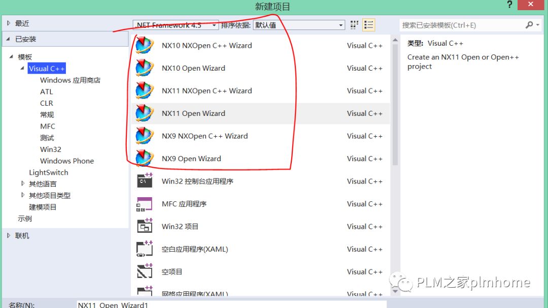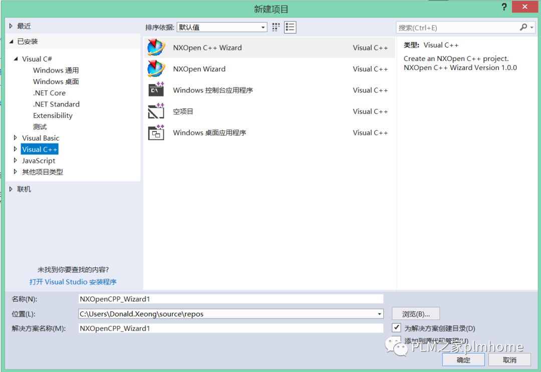 0 G8 R! |- D8 h# L打开VS2017,新建项目,你将会看到,这样的界面,模板证明可以创建了。 通过向导,完成后,直接进行编译,你会发现一切正常。 你也许运气好,加了一行代码,编译成功,还弹出了,hello plmhome。 但是别高兴太早,大部分人可能是编译出问题的,接下来我们说下经验的事情(如果没看到这里,那就是没缘分哦,好嗨哦!)