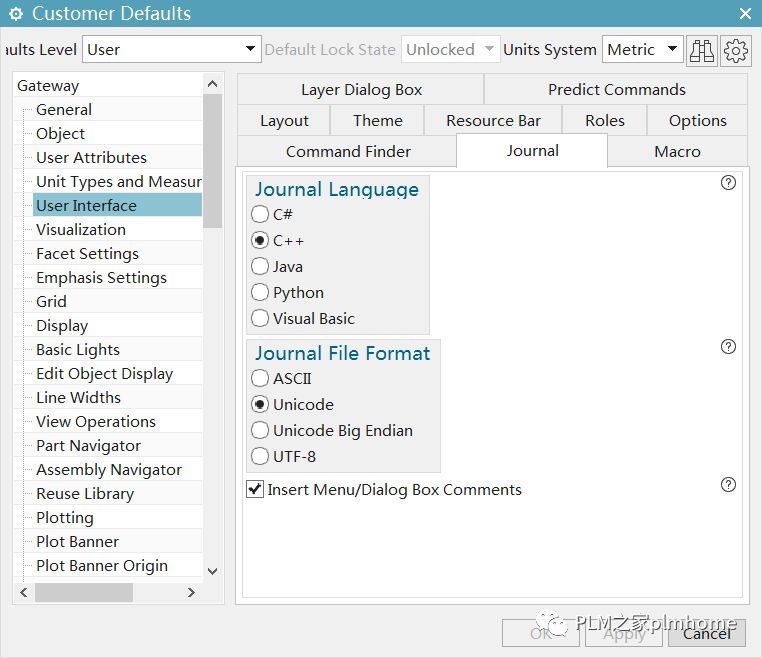 (3) JA 的录制是二次开发最实用,最不用动脑子的过程,既然你已经选择了适合的开发语言,为何不把录制JA设成默认的语言呢?方法如下啦:NX首选项--》用户默认设置,启动NX后就生效了。 (4)关于NX版本和VS对应版本的问题,这里我只是建议下,诚然你可以用一个适合你的版本去做开发,但是建议还是和官方对应的版本靠齐,避免不必要的问题。PLM之家网站上有详细的linux,macos,windows不同版本的编译器和IDE说明可以去参考! (5)还有的再说啦,困觉!!! ; d+ u# t8 P% S9 e