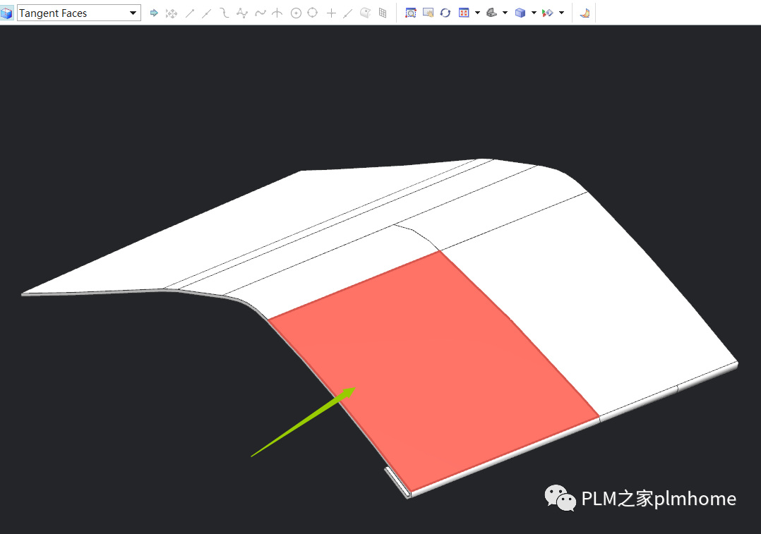 6 D. ^1 T& O" U$ E) ^6 R! m(2)选择相切面的效果,如果我们选中图示高亮部分的面,通过Tangent Faces,系统会自动获取所有和这个面相切的面,并进行高亮